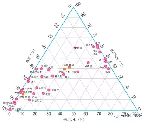 在遠離圖12左下角的國家中,一些國家主要使用焚燒發(fā)電技術(shù),比如瑞士、瑞典、丹麥、挪威;另一些國家則主要依靠循環(huán)利用,比如荷蘭、比利時、德國、奧地利。在諸如瑞士、丹麥、荷蘭、奧地利、瑞典、比利時、丹麥、挪威這些國家,雖然填埋處置率已經(jīng)低于5%,但卻仍然距實現(xiàn)100%的循環(huán)利用有著很大的距離。