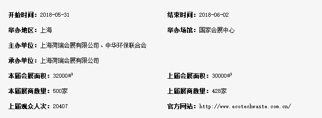 2018年第四屆上海國(guó)際固廢氣展將于2018年5月31日-6月2日在國(guó)家會(huì)展中心(上海)舉行,展覽面積將達(dá)到32,000平方米,來(lái)自全球的參展商將達(dá)到500+家,高效邀約優(yōu)質(zhì)參觀團(tuán)100+個(gè),專業(yè)觀眾35,000+位。