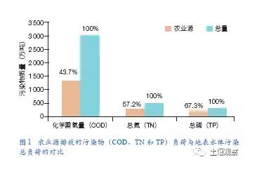 面源污染按照來源的不同,可細(xì)化為農(nóng)業(yè)面源污染和城市面源污染。隨著城市污水收集管道和雨污分流工程的建設(shè),城市面源污染正逐步得到解決。相對(duì)城市地區(qū),農(nóng)業(yè)面源污染不但多年來一直是我國“三河三湖”污染的主要污染源,也漸成為農(nóng)村地表水體污染的主要貢獻(xiàn)者,嚴(yán)重威脅全國人民的飲水安全。據(jù)2010年《第一次全國污染源普查公報(bào)》結(jié)果顯示,農(nóng)業(yè)污染源是造成我國水環(huán)境污染的“大戶”,其化學(xué)需氧量(COD)、總氮(TN)和總磷(TP)排放分別占地表水體污染總負(fù)荷的43.7%、57.2% 和67.4%(圖1)??梢?,農(nóng)業(yè)面源污染已經(jīng)成為當(dāng)前地表水體污染的主要來源。全球每年用于糧食生產(chǎn)的1.2億噸氮中,只有 10%被人類直接消費(fèi),大部分未使用的氮?jiǎng)t被分散到廣泛的環(huán)境中,最終匯入地表水體,成為主要的面源污染源。農(nóng)業(yè)則是導(dǎo)致過量養(yǎng)分排放到水體中的最主要驅(qū)動(dòng)因素。研究表明,太湖約 58%和40% 比例的總氮和總磷來自于農(nóng)業(yè)產(chǎn)生的面源污染。