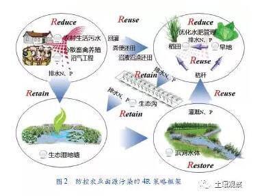 因此,我國農(nóng)業(yè)面源污染控制須走大區(qū)域聯(lián)控之路,即不僅要集成度高,而且從點(diǎn)到面、從線性到空間的全過程、全區(qū)域的覆蓋。“十五”至“十二五”期間,基于區(qū)域污染物聯(lián)控思路,我國已形成了“源頭減量(Reduce)—過程阻斷(Retain)—養(yǎng)分再利用(Reuse)—生態(tài)修復(fù)(Restore)”的4R策略。迄今為止,針對(duì)上述各農(nóng)業(yè)面源污染防控四個(gè)過程的技術(shù)研究頗多,技術(shù)儲(chǔ)備也相當(dāng)豐厚,相應(yīng)的工程運(yùn)行也取得一定成效。