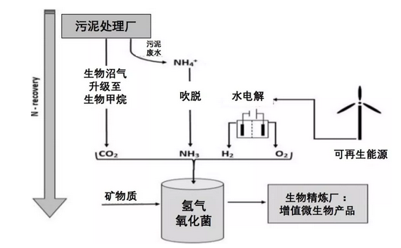 ▲ 基于氫氣與現(xiàn)有污水廠結(jié)合的生物精煉廠工藝流程圖