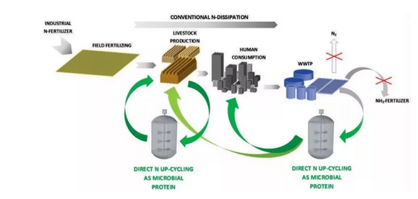 2015年5月,IWA厭氧專家組成員、比利時根特大學(xué)的Willy Verstraete教授和他的學(xué)生Silvio Matassa在期刊《環(huán)境科學(xué)與工程(ES&T)》發(fā)表了題為“Can direct conversion of used nitrogen to new feed andprotein help feed the world?”的文章,提出了一種新的轉(zhuǎn)化路徑——能量到蛋白質(zhì)(power-to-protein)。其本質(zhì)是直接將污水中的氨氮轉(zhuǎn)化成微生物蛋白質(zhì),跳過氮氣轉(zhuǎn)化這一步,形成一個抄近路的氮循環(huán)的升級模式。這是一種可持續(xù)的蛋白質(zhì)生產(chǎn)方式,它比傳統(tǒng)經(jīng)典方法耗能更少,并且將“廢物”轉(zhuǎn)化為高附加值的產(chǎn)品。
