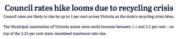 據(jù)《The Age》報(bào)道,維州垃圾回收危機(jī)將造成市政費(fèi)上漲高達(dá)5%。市政費(fèi)是市政廳對管轄區(qū)內(nèi)所有業(yè)主(包括居民和企業(yè))征收的費(fèi)用,其中有一部分會用于當(dāng)?shù)氐睦幚怼?/p>
