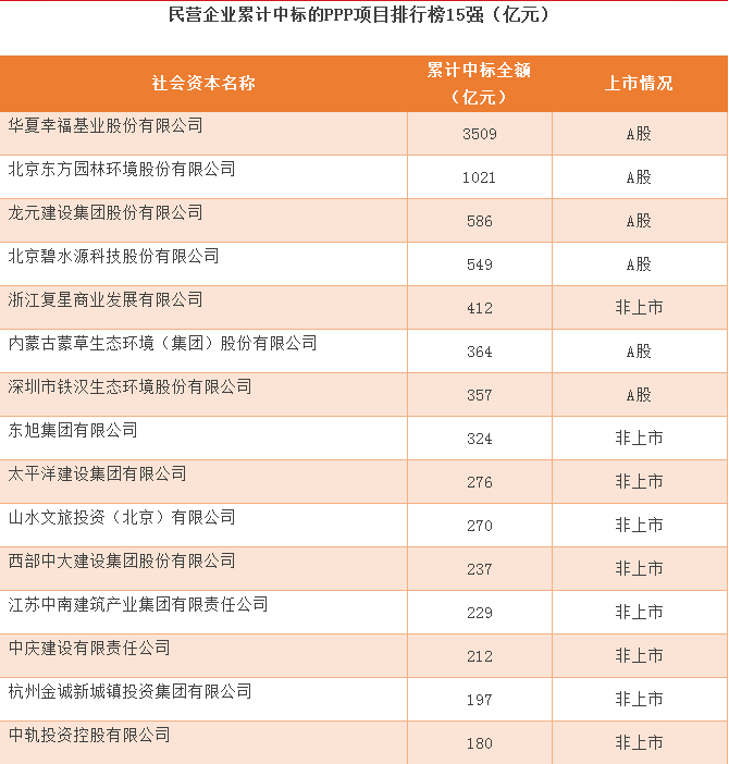 民營企業(yè)累計中標(biāo)PPP項目15強分析