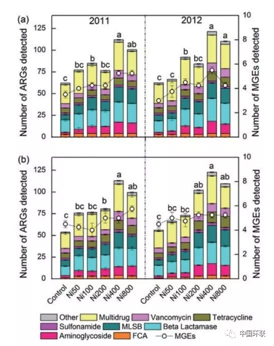 抗生素對(duì)細(xì)菌感染、致病微生物感染類疾病的防治具有重要作用,但由此而來的抗性基因的快速增加和傳播也威脅著人體健康??剐曰虻难芯吭桨l(fā)受到學(xué)者關(guān)注,成為研究熱點(diǎn)。除抗生素選擇產(chǎn)生抗性基因外,環(huán)境中重金屬對(duì)抗生素抗性的選擇和傳播擴(kuò)散具有重要作用。中國科學(xué)院生態(tài)環(huán)境研究中心Hu等通過對(duì)Ni長期污染土壤誘導(dǎo)的抗性基因進(jìn)行研究,發(fā)現(xiàn)在長期不同程度Ni污染下,共檢測(cè)到149種抗性基因,以多藥和β-內(nèi)酰胺類抗生素抗性為主,抗性基因的頻率和豐度隨Ni污染程度的增加而升高(圖3);抗性基因與可移動(dòng)抗性原件具有顯著相關(guān)性,表明Ni污染增加了抗性基因的水平轉(zhuǎn)移,該水平轉(zhuǎn)移與intI1整合子有關(guān)。區(qū)別于以往重金屬的直接毒性風(fēng)險(xiǎn),該研究闡述了重金屬在土壤環(huán)境中的間接風(fēng)險(xiǎn)-增加抗性基因產(chǎn)生和傳播風(fēng)險(xiǎn)。