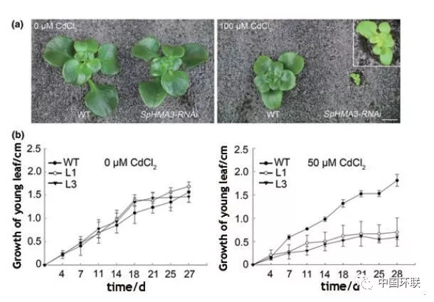 利用超積累植物修復(fù)重金屬污染土壤一直是研究學(xué)者們關(guān)注的焦點(diǎn)。區(qū)別于普通植物,超積累植物地上部可富集高濃度的重金屬。其可能作用機(jī)制為:超積累植物的根際對(duì)土壤重金屬活化效應(yīng);超積累植物對(duì)重金屬具有快速的吸收轉(zhuǎn)運(yùn)體系;超積累植物對(duì)重金屬具有強(qiáng)的解毒儲(chǔ)存能力。浙江大學(xué)Hou等對(duì)比研究重金屬超積累型和非超積累型植物的根際特征,發(fā)現(xiàn)與非超積累型植物相比,超積累型植物根際具有更為龐大的根系,土壤pH值較低,重金屬有效性高;根際土壤重金屬有效性與超積累植物特異的細(xì)菌群落具有顯著相關(guān)性,微生物群落功能分析(PICRUSt)超積累植物根際細(xì)菌豐度相對(duì)較高,其相應(yīng)的功能與膜運(yùn)輸和氨基酸代謝相關(guān)。該研究揭示了超積累植物根際特征,尤其是特異的根際細(xì)菌群落組成對(duì)超積累植物吸收重金屬的作用。除超積累植物特殊的根際效應(yīng)外,其植物本身對(duì)重金屬吸收和存儲(chǔ)能力亦是超積累重金屬主要機(jī)制。浙江大學(xué)Tian等對(duì)超積累型和非積累型東南景天對(duì)Cd吸收、分布以及細(xì)胞水平上耐性進(jìn)行研究。Cd在非積累型植物葉和莖中維管束中有少量分布,而超積累植物Cd含量高,且不同組織和時(shí)間上差異較大;兩種植物在Cd向葉原生質(zhì)運(yùn)輸?shù)膭?dòng)力學(xué)上沒有較大差異,但超積累型在Cd的液泡存儲(chǔ)上更為高效。該研究結(jié)果表明相對(duì)于快速運(yùn)輸至薄壁細(xì)胞,Cd的液泡高效存貯是東南景天莖中積累Cd的更為重要的機(jī)制。超積累植物對(duì)重金屬的積累和解毒機(jī)制受控于體內(nèi)特有基因表達(dá)。中國科學(xué)院植物研究所Liu等對(duì)鎘鋅超積累植物伴礦景天Cd耐性基因進(jìn)行研究,發(fā)現(xiàn)伴礦景天體內(nèi)的ATP酶3基因(SpHMA3)對(duì)其Cd在體內(nèi)解毒具有重要作用,酵母中外源SpHMA3表達(dá)試驗(yàn)表明其具有Cd專一運(yùn)輸活性,對(duì)Cd敏感而對(duì)Zn不敏感,SpHMA3基因在非超積累型景天中超量表達(dá)可增加其對(duì)Cd的耐性和積累性,但對(duì)Zn無效應(yīng)。該研究結(jié)果證實(shí)位于液泡膜上的SpHMA3基因?qū)χ参顲d解毒機(jī)制起著重要作用,能保持伴礦景天在Cd污染土壤上正常生長(圖5)。