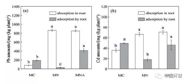 圖6 不同化學(xué)試劑對(duì)植物根吸附和吸收Pb和Cd的影響