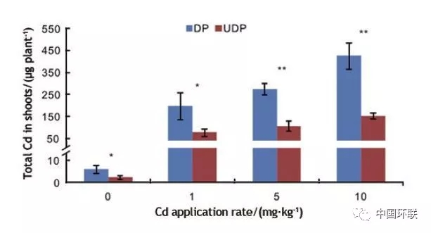 圖7 去頂(DP)和不去頂(UDP)處理植物對(duì)Cd吸收
