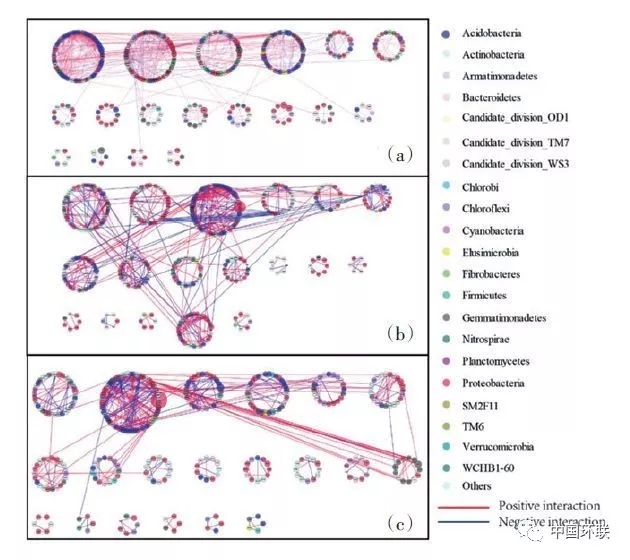 圖9 不種植物(a)和種植大豆(b)與玉米(c)對(duì)鎘污染土壤細(xì)菌網(wǎng)絡(luò)關(guān)系的影響