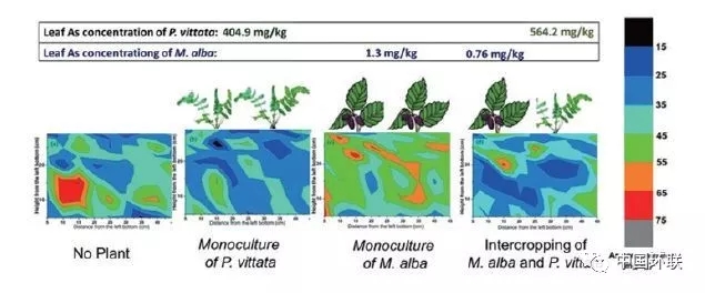 除降低可食作物對(duì)重金屬吸收外,在重金屬污染土壤上種植經(jīng)濟(jì)作物,阻控重金屬在食物鏈中的傳遞風(fēng)險(xiǎn),也是污染農(nóng)田安全利用的措施之一。華中農(nóng)業(yè)大學(xué)Yang等針對(duì)重金屬污染土壤研究重金屬耐性經(jīng)濟(jì)作物3種種植模式(油菜-向日葵、油菜-花生、油菜-芝麻),對(duì)土壤重金屬去除效應(yīng)和農(nóng)作物中重金屬濃度的影響進(jìn)行了研究。結(jié)果表明,油菜-向日葵種植模式去除Cd最高,可達(dá)459 g·ha-1,去除率為1.98%;利用正己烷提取后作物油符合相應(yīng)標(biāo)準(zhǔn),去油后種子殘?jiān)俳?jīng)酒石酸鉀提取后,其重金屬濃度低于飼料標(biāo)準(zhǔn)。經(jīng)濟(jì)作物與超積累植物間作,在安全生產(chǎn)的同時(shí)也能去除土壤污染物,實(shí)現(xiàn)修復(fù)目的。但是在超積累植物和其他植物間作體系下,超積累植物對(duì)重金屬活化和吸收機(jī)制還不清楚,超積累植物是否活化重金屬,增加非超積累植物對(duì)重金屬吸收。中國科學(xué)院地理科學(xué)與資源研究所Wan等開展了As超積累植物蜈蚣草和桑樹間作的研究,探討了邊生產(chǎn)邊修復(fù)機(jī)制。與單作相比,間作處理?xiàng)l件下蜈蚣草中As濃度顯著增加、桑樹As則顯著降低;對(duì)不同處理下土壤As的空間分布分析發(fā)現(xiàn),不論單作或間作處理蜈蚣草根周圍土壤As濃度較低,沒有活化土壤As(圖10),且在間作處理下桑樹葉中As濃度符合國家飼料標(biāo)準(zhǔn)。