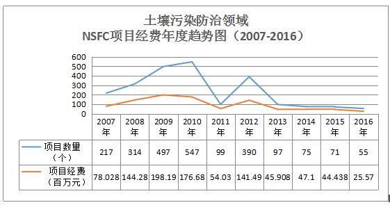 通過統(tǒng)計(jì)2007-2016十年內(nèi)我國(guó)國(guó)家自然科學(xué)基金的項(xiàng)目數(shù)據(jù),可知土壤污染防治領(lǐng)域的項(xiàng)目經(jīng)費(fèi)在2007-2010年呈穩(wěn)步上升趨勢(shì),2010年申請(qǐng)通過的項(xiàng)目達(dá)峰值547個(gè),2011年有所回落,2012年又激增到390個(gè),之后幾年呈現(xiàn)了下降趨勢(shì),2016年僅通過55個(gè)項(xiàng)目,經(jīng)費(fèi)也隨之下降,如圖9所示。