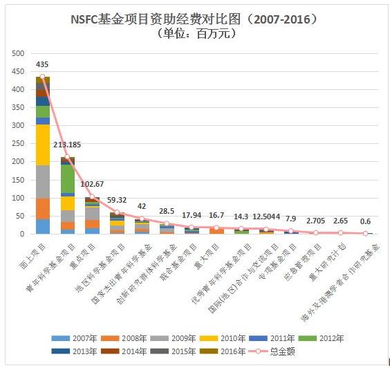 圖10國(guó)家自然科學(xué)基金項(xiàng)目資助經(jīng)費(fèi)對(duì)比圖(2007-2016年)