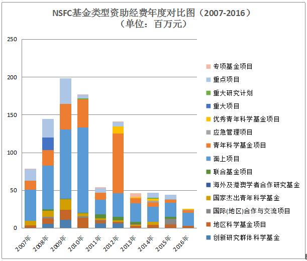 圖11國(guó)家自然科學(xué)基金基金類型資助經(jīng)費(fèi)年度對(duì)比圖(2007-2016年)
