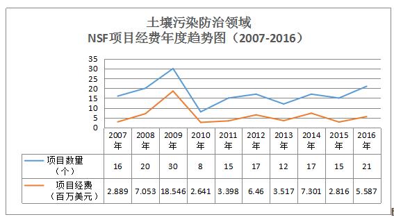 通過項(xiàng)目數(shù)據(jù)分析(見圖12),在土壤污染防治領(lǐng)域,美國(guó)國(guó)家科學(xué)基金資助經(jīng)費(fèi)在2007年至2009年呈現(xiàn)了穩(wěn)步遞增的趨勢(shì),2009年項(xiàng)目數(shù)量達(dá)到峰值30個(gè)。2010年出現(xiàn)拐點(diǎn),項(xiàng)目數(shù)量下降為8個(gè),2011年又開始回升,之后5年一直較為平穩(wěn),2016年有所增加,達(dá)到21個(gè)。