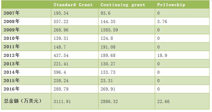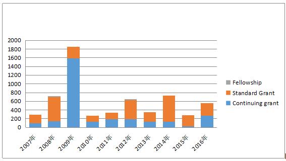 表8美國(guó)國(guó)家科學(xué)基金項(xiàng)目資助類型經(jīng)費(fèi)表(2007-2016年)