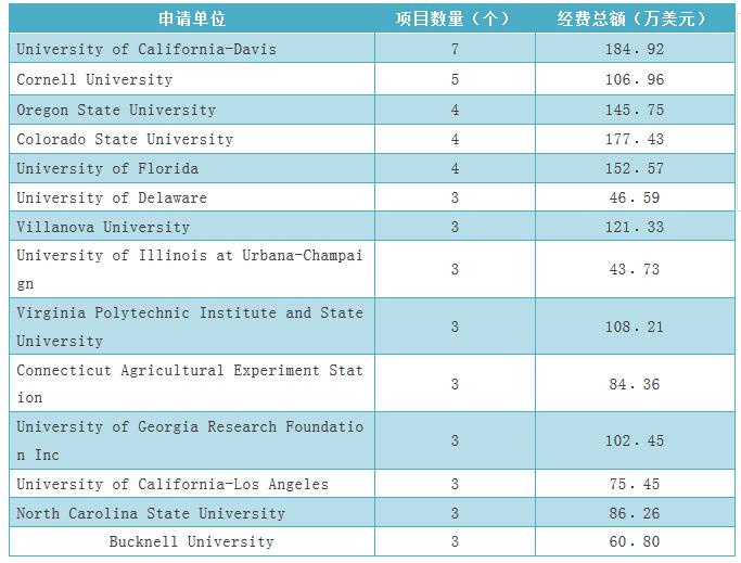 根據(jù)統(tǒng)計(jì),本領(lǐng)域申請(qǐng)年份在2007年至2016年間,共有135個(gè)機(jī)構(gòu)申請(qǐng)了美國(guó)國(guó)家科學(xué)基金。其中申請(qǐng)數(shù)量超過2個(gè)的機(jī)構(gòu)有14個(gè)獲得經(jīng)費(fèi)約為1496.8萬(wàn)美元,如表9所示。