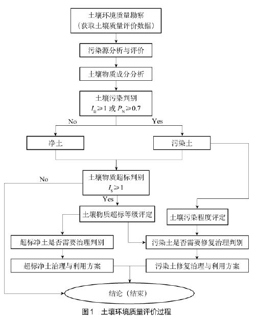 由圖1可知,土壤環(huán)境質(zhì)量評價包括土壤污染評價和土壤物質(zhì)符合環(huán)境質(zhì)量要求的評價兩部分內(nèi)容。其中,土壤污染評價主要包括土壤污染與否判別、土壤中致污物質(zhì)是否超標(biāo)判別與土壤污染程度評價。實施土壤環(huán)境質(zhì)量評價時,首先應(yīng)判別某土壤是否受到了某物質(zhì)的污染,即確定該土壤是污染土還是凈土。然后,對于凈土,應(yīng)進一步判別某物質(zhì)成分是否符合土壤質(zhì)量標(biāo)準(zhǔn)要求,如果符合土壤環(huán)境如果不符合土壤環(huán)境質(zhì)量要求,應(yīng)進一步研究土壤的利用或治理方法。對于污染土,應(yīng)首先判別致污物質(zhì)含量是否符合土壤環(huán)境質(zhì)量要求,如果致污物質(zhì)含量符合土壤環(huán)境質(zhì)量要求,給出結(jié)論并結(jié)束評價;如果致污物質(zhì)含量不符合土壤環(huán)境質(zhì)量要求,應(yīng)結(jié)合土壤污染程度評價結(jié)果,進一步研究污染土利用、修復(fù)或治理方案。