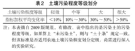 (4)土壤污染程度等級劃分。土壤污染程度是指侵入土壤的致污物質(zhì)對土壤成分及土體結(jié)構(gòu)和性質(zhì)的綜合影響程度,不僅指土壤成分和結(jié)構(gòu)的變化程度,還包括土體強度、變形、滲透、腐蝕、吸附、酸堿度、氧化還原、生物養(yǎng)分、毒性等的變化程度,具體視土壤污染程度評價的目的而定,對于農(nóng)地土壤,宜側(cè)重于土壤化學(xué)成分評價;對建設(shè)用地,宜側(cè)重于土體強度、變形等力學(xué)性質(zhì)評價。確定土壤污染程度時,應(yīng)首先分別計算出每種致污物質(zhì)所引起的土壤成分、結(jié)構(gòu)和各種性質(zhì)指標(biāo)變化的變化率(污染前后指標(biāo)的差值與污染前指標(biāo)值之百分比)。然后,分別計算各指標(biāo)變化率的平均值。然后,再計算各指標(biāo)平均變化率的加權(quán)平均值。最后,依據(jù)加權(quán)平均變化率按表2確定土壤污染程度等級。