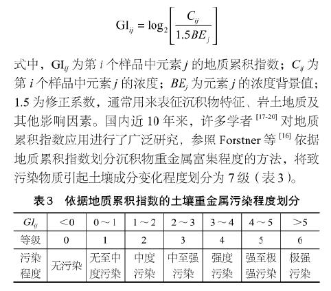 5)致污物質(zhì)對土壤物質(zhì)成分的影響程度評價。除了規(guī)范HJ/T166規(guī)定的內(nèi)梅羅指數(shù)法,還可選用地質(zhì)累積指數(shù)法。地質(zhì)累積指數(shù)(geoaccumulationindex,GI)是法國科學(xué)家Muller[14]于1969年提出的用于定量評價沉積物(或其他物質(zhì))中重金屬富集程度的指標(biāo)[15,16],其表達(dá)式如下:
