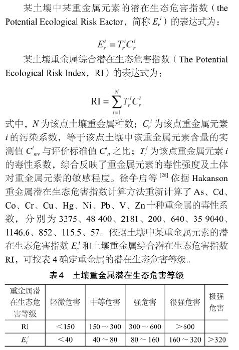 6)致污染物質(zhì)的潛在生態(tài)危害評價。潛在生態(tài)危害指數(shù)法是瑞典地球化學(xué)家Hakanson于1980[21]創(chuàng)建的,是以沉積學(xué)原理評價環(huán)境重金屬污染及其生態(tài)危害的方法。由于該方法同時考慮了重金屬的種類、濃度、毒性水平及土體對重金屬的敏感性等因素,較為科學(xué)合理,因此,被廣泛應(yīng)用于土壤環(huán)境質(zhì)量評價,國內(nèi)有不少學(xué)者[22-26]在評價土壤環(huán)境質(zhì)量時應(yīng)用了這種方法,并進行了較深入的研究。