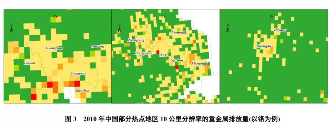 為進一步探討重金屬排放的空間特征,本文將城市層面的排放量進行高分辨率空間量化。如圖2所示,以鉻為例,由于在工業(yè)結構、發(fā)展程度和污染源分布上的巨大差異,中國鉻排放的地域分布極不均勻。研究發(fā)現,按照網格排放量大小進行排序,鉻排放量占比超1%的8個網格集中于廣東、江蘇、河北和山東,其排放量占比達到15%,通過鉻的排放量分布圖可以看出,鉻的排放具有較為明顯的沿海分布特征。