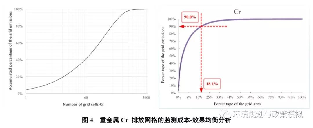 從污染監(jiān)控的經濟學角度來說,對排放網格進行監(jiān)測并不都是高效的,當監(jiān)測效果增長快于監(jiān)測成本增加時,對此排放網格進行監(jiān)測是經濟高效的。以鉻為例,經監(jiān)測成本-效果評估后監(jiān)測高效網格的排放總量占比約90%左右。