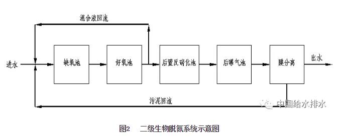 事實(shí)上經(jīng)過單級(jí)生物脫氮處理后,出水中仍會(huì)含有一定量的硝酸鹽,尤其是進(jìn)水氨氮濃度高的情況下,出水中硝酸鹽的含量會(huì)更高,總氮也相應(yīng)偏高。在出水對(duì)總氮有嚴(yán)格要求的地區(qū),為保證出水總氮達(dá)標(biāo),在單級(jí)生物脫氮后再增設(shè)后置反硝化池和后曝氣池,亦即二級(jí)生物脫氮系統(tǒng),通過投加外加碳源,利用微生物的硝化和反硝化反應(yīng)進(jìn)一步去除剩余的硝酸鹽,進(jìn)而達(dá)到提高總氮去除率的目的。