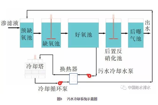 由于高濃度污水在生化反應(yīng)過程中會(huì)釋放出大量的熱能,同時(shí)由于部分電能轉(zhuǎn)化成熱能的緣故,垃圾滲濾液處理生物池內(nèi)會(huì)保持較高的溫度,過高的水溫會(huì)抑制微生物的活性,嚴(yán)重時(shí)會(huì)使生化處理系統(tǒng)癱瘓。因此垃圾滲濾液生化處理均設(shè)有污水冷卻系統(tǒng),用污水泵抽取生物池內(nèi)的混合液進(jìn)入換熱器,與冷卻水在換熱器內(nèi)進(jìn)行熱交換,降溫后混合液再回到生物池內(nèi),從而達(dá)到降低生物池內(nèi)水溫的目的。