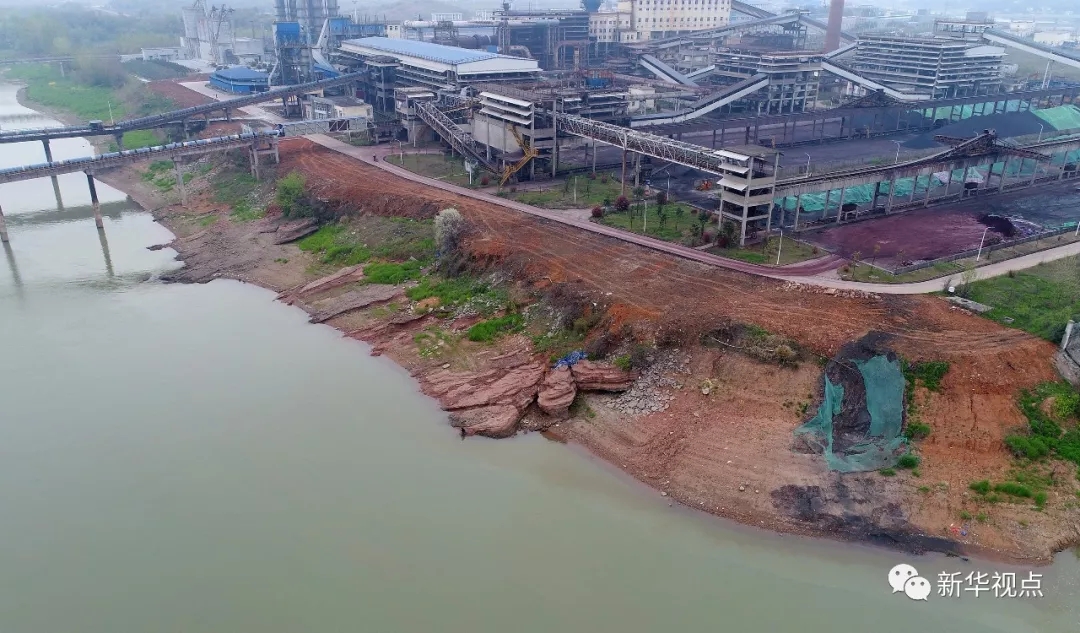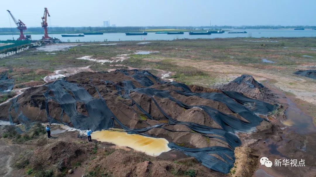 這是3月29日用無人機(jī)拍攝的安徽貴池前江工業(yè)園內(nèi)池州恒鑫材料科技有限公司廠區(qū)內(nèi)的長江堤岸旁傾倒的選礦尾渣。新華社記者 郭晨 攝