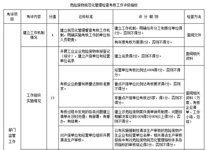(三)省廳督查考核。省廳將在3月至12月隨時、不定期組織對各市的危險廢物規(guī)范化管理工作進行督查考核評級,并將督查結果報送環(huán)保部,同時進行全省排名、網上公示。