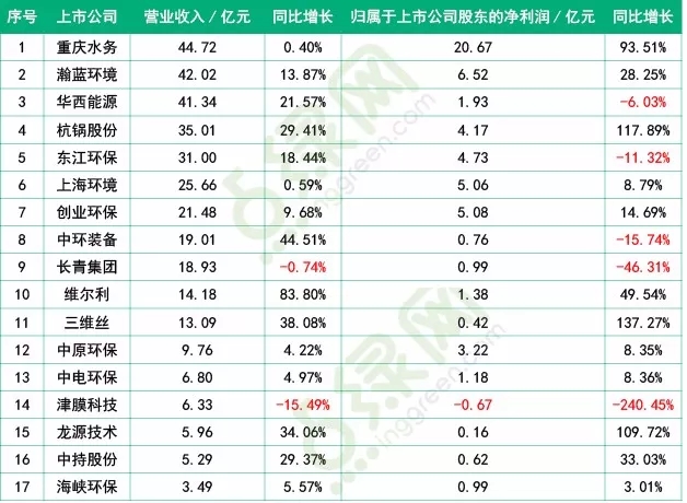 截止4月3日止共有17家環(huán)保上市公司發(fā)布2017年年報(其余將繼續(xù)跟進(jìn))。2017年?duì)I收排名靠前重慶水務(wù)、瀚藍(lán)環(huán)境、華西能源均在40億以上,營收僅津膜科技和長青集團(tuán)同比下降。