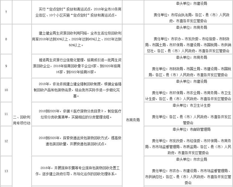 (一)一年細(xì)分目標(biāo)。2018年,全市生活垃圾增長(zhǎng)率控制在2.5%以下;市區(qū)城區(qū)、縣(市)城區(qū)和農(nóng)村分類覆蓋面分別達(dá)到80%、60%和75%;全市黨政機(jī)關(guān)和企事業(yè)單位實(shí)施強(qiáng)制分類覆蓋面達(dá)到100%,全市城區(qū)社會(huì)組織、公共場(chǎng)所和相關(guān)企業(yè)實(shí)施強(qiáng)制分類覆蓋面達(dá)到80%;新增生活垃圾焚燒穩(wěn)定運(yùn)行處置能力2250噸/日、餐廚垃圾處置能力500噸/日;新增省級(jí)高標(biāo)準(zhǔn)生活垃圾分類示范小區(qū)、示范村各25個(gè);初步建立全市再生資源回收利用網(wǎng)絡(luò),其中培育回收骨干企業(yè)8家;完成城區(qū)范圍內(nèi)不符合規(guī)范要求的生活垃圾清運(yùn)車輛和中轉(zhuǎn)站整治改造;市、縣兩級(jí)初步建立生活垃圾分類處理智能化大數(shù)據(jù)平臺(tái);城鄉(xiāng)生活垃圾分類投放正確率穩(wěn)步提升,回收利用率、資源化利用率、無(wú)害化處理率分別達(dá)到30%以上、80%以上、100%。