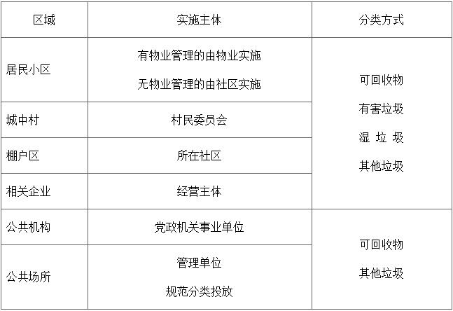 根據(jù)生活垃圾成分構(gòu)成與產(chǎn)生主體的特點(diǎn),實(shí)行“4+2”分類(lèi)方式,即居民小區(qū)、城中村、棚戶區(qū)、相關(guān)企業(yè)采用四分法,分為可回收物、有害垃圾、濕垃圾、其他垃圾;公共機(jī)構(gòu)、公共場(chǎng)所采用二分法,分為可回收物、其他垃圾。
