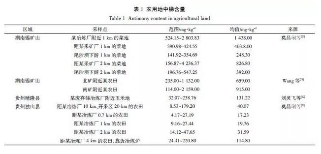 我國豐富的銻資源在促進了工業(yè)以及醫(yī)療等領域發(fā)展的同時,也帶來了一定的環(huán)境隱患。根據近年來對銻礦山周圍農用地土壤的調查研究發(fā)現(表 1),土壤中的平均銻含量多集中于17.23~1 438.00 mg˙kg-1,遠高于湖南省(2.98 mg˙kg-1)和貴州省(2.24 mg˙kg-1)背景值,且在不同的地方其污染程度表現出較大的區(qū)別。主要是由于廢礦、爐渣堆放的緣故以及受到銻塵、煙氣沉降、雨水淋溶等因素的影響,造成銻等重金屬遷移至土壤之中,使得附近的河流、土壤以及植物中經常能檢測到較高的銻含量。此外銻可以隨大氣、河流等遷移至遠離污染源的地區(qū),形成跨區(qū)域遠程污染。項萌等研究發(fā)現,廣西河池南丹縣銻礦冶煉區(qū)土壤銻的濃度為195~2 034 mg˙kg-1,且其含量與距離冶煉廠的距離密切相關,其中在0~400 m 內急劇衰減,衰減幅度達90%,在400~2 400 m 范圍緩慢衰減,影響范圍可以達到很遠,而在3 種不同土壤環(huán)境中(水稻田、菜地、荒地),銻含量表現為水稻田>菜地>荒地。也有研究表明,過去的30 年內,北極圈大氣中的銻含量增加了50%,證實了跨區(qū)域銻污染的可能性。但調查研究發(fā)現,由于對銻污染及健康風險認識的不足以及環(huán)保治理意識較弱,礦區(qū)80%的農民只有在確實種不出農作物的時候才意識到土壤被污染了,且農用地的利用多樣性較低,結構表現單一。