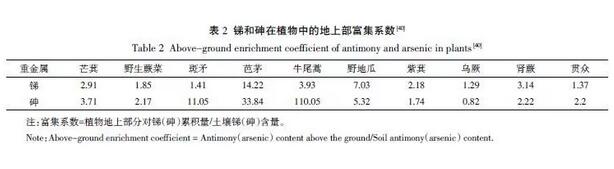 土壤中銻形態(tài)的分布特征會對其在土壤-植物體系中的富集轉運能力產生一定影響。相關研究者比較了蜈蚣草、斑矛、五節(jié)芒、粽葉蘆對砷和銻的轉運能力,發(fā)現只有五節(jié)芒和粽葉蘆從根部到地上部(莖/葉)對銻具有較好的轉運能力,而4 類植物對砷都表現出了良好的轉運能力,說明銻在植物體中的轉運能力相對于砷較弱。文吉昌等的研究結果(表 2)表明,除了個別植物對銻的富集能力大于砷外,其余植物對銻的富集能力均遠小于砷。也有研究表明,植物地上部的銻含量與根部含量之間沒有相關性(r=0.19),植物吸收的銻并非單一來自土壤的釋放,還有一部分可能來自大氣沉降,進一步表明了銻在植物中具有較弱的富集轉運能力。