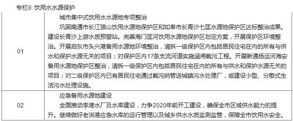 深入推進(jìn)飲用水水源地環(huán)境保護(hù)執(zhí)法專項(xiàng)行動,加大集中式飲用水水源地保護(hù)區(qū)內(nèi)違章建設(shè)項(xiàng)目的清拆力度,依法查處保護(hù)區(qū)內(nèi)的違法行為。鞏固狼山飲用水水源地環(huán)境問題整治成果,逐步搬遷飲用水源地二級保護(hù)區(qū)內(nèi)集裝箱及散貨專業(yè)碼頭。排查和依法取締飲用水水源保護(hù)區(qū)內(nèi)的排污口以及影響水源地保護(hù)的碼頭,實(shí)施水源地及周邊區(qū)域環(huán)境綜合整治。定期調(diào)查評估集中式地下水型飲用水水源補(bǔ)給區(qū)環(huán)境狀況。依法劃定飲用水水源地保護(hù)區(qū),定期開展縣級以上集中式飲用水水源地環(huán)境狀況調(diào)查評估,按照“水量保證、水質(zhì)達(dá)標(biāo)、應(yīng)急保障”的要求,加強(qiáng)飲用水水源地及應(yīng)急備用水源達(dá)標(biāo)建設(shè)。對未達(dá)到Ⅲ類水質(zhì)要求的飲用水水源要制定并實(shí)施水質(zhì)達(dá)標(biāo)方案。加強(qiáng)飲用水水源風(fēng)險(xiǎn)防控體系建設(shè),進(jìn)一步優(yōu)化沿江取水口和排污口布局。強(qiáng)化對水源周邊可能影響水源安全的制藥、化工、造紙、制革、印染、電鍍、農(nóng)藥等重點(diǎn)行業(yè)企業(yè)的執(zhí)法監(jiān)管。推進(jìn)水廠加速提標(biāo)擴(kuò)能,組織實(shí)施狼山水廠深度處理改造,實(shí)現(xiàn)供好水向供優(yōu)質(zhì)水轉(zhuǎn)變。到2020年,全市基本實(shí)現(xiàn)“雙源供水”。