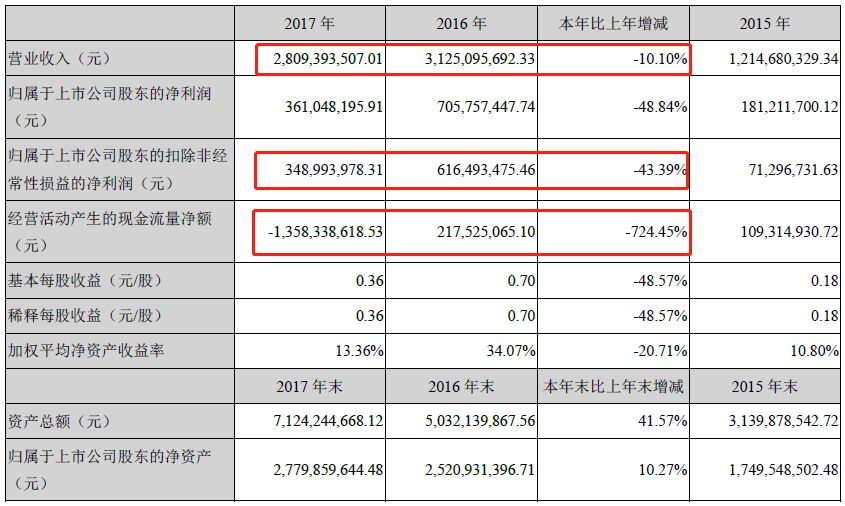 神霧環(huán)保2017年財報顯示,截止2017年末,神霧環(huán)??偁I收28.09億元,與上年同期相比減少10.10%,歸屬母公司的凈利潤3.61億元,與上年同期相比減少48.84%,經營活動產生的現(xiàn)金流量凈額-13.58億元,與上年同期相比減少724.45% ,營收能力和盈利能力顯著下降,流動資金十分緊張。
