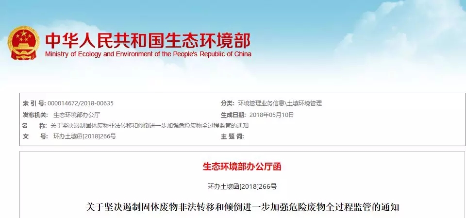 生態(tài)環(huán)境部日前印發(fā)了《關(guān)于堅決遏制固體廢物非法轉(zhuǎn)移和傾倒 進(jìn)一步加強危險廢物全過程監(jiān)管的通知》(環(huán)辦土壤函〔2018〕266號,以下簡稱《通知》)。