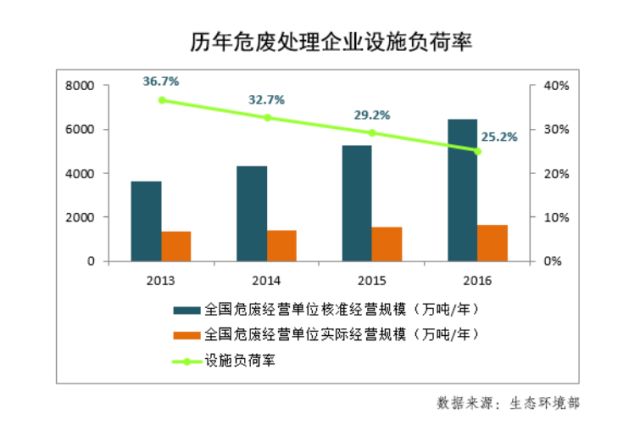 據(jù)生態(tài)環(huán)境部數(shù)據(jù)顯示,危廢處置企業(yè)的設(shè)施負(fù)荷率常年處于低水平運行,且有逐年下降趨勢。處理資質(zhì)與市場需求錯配,導(dǎo)致產(chǎn)能結(jié)構(gòu)化過剩。同時,產(chǎn)能區(qū)域性布局不合理亦是造成危廢處置企業(yè)整體負(fù)荷率低的重要因素。