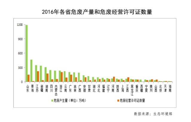 2016年,持證企業(yè)數(shù)量最多的省份是江蘇,有221家,占全國持證總數(shù)的10%。而危廢產(chǎn)量第二的青海省,持證企業(yè)僅有19家,且核準(zhǔn)的經(jīng)營規(guī)模不到危廢產(chǎn)量的1/10,市場供給嚴(yán)重不足。