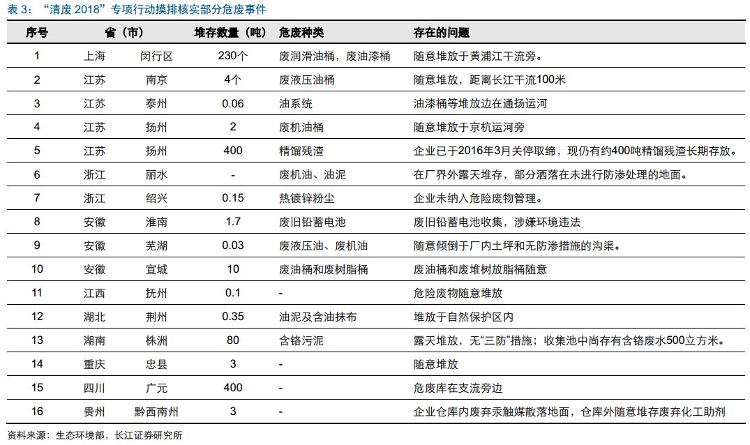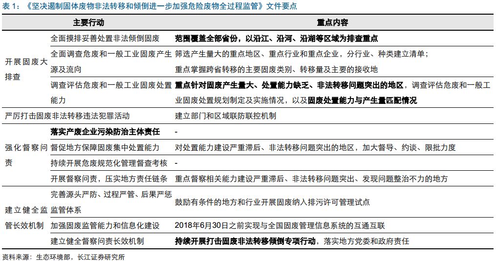5月22日生態(tài)環(huán)境部印發(fā)《關于堅決遏制固體廢物非法轉移和傾倒進一步加強危險廢物全過程監(jiān)管的通知》,提出“提高政治站位,切實增強“四個意識”,深刻認識遏制固體廢物非法轉移和傾倒,加強危險廢物全過程監(jiān)管工作的重要性;要按照省級督導、市縣落實、嚴厲打擊、強化監(jiān)管的總體要求摸清固體廢物,特別是危險廢物產生、貯存、轉移、利用、處置情況”。既要摸清家底,又要強調處置能力總量建設和處置種類匹配程度;強調產廢企業(yè)的污染防治主體責任和政府長效監(jiān)管責任。該文件是全國環(huán)保大會后發(fā)布的第二個指向明確的環(huán)境整治行動(第一個是飲用水源地專項督查),排查范圍由“清廢2018”的長江沿線11個省擴展至全國,行動定位上升至“政治站位”高度,統(tǒng)一思想,危廢景氣度提升。