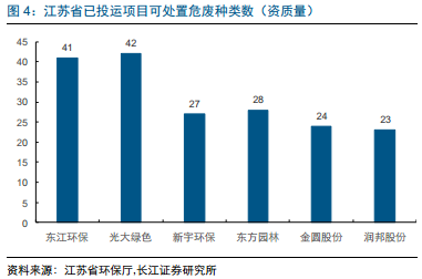 就江蘇省內來看,各個城市投運危廢產能最大上市企業(yè)分布,蘇州是光大綠色環(huán)保(4萬噸焚燒投運+2萬噸焚燒在建);常州是光大綠色環(huán)保(3萬噸焚燒投運);南通是潤邦股份(2.5萬噸焚燒+0.3萬噸醫(yī)廢投運);鹽城是新宇環(huán)保(8.7萬噸焚燒投運+3.3萬噸焚燒在建);連云港是光大綠色環(huán)保(3.2萬噸焚燒運營),南京是光大綠色環(huán)保(3萬噸在建),鎮(zhèn)江是新宇環(huán)保(3.47萬噸投運),徐州是光大綠色環(huán)保(0.96萬噸焚燒投運),宿遷市是新宇環(huán)保(4萬噸焚燒運營)。