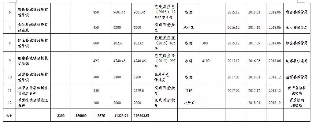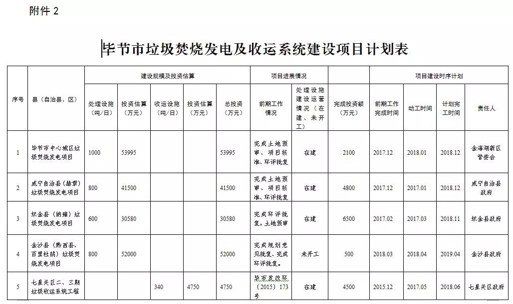 (一)項(xiàng)目攻堅(jiān)(2018—2019年),集中解決垃圾處理設(shè)施短板。規(guī)劃建設(shè)城鄉(xiāng)垃圾收運(yùn)處理設(shè)施,新增垃圾處理能力4400噸/日,新增垃圾轉(zhuǎn)運(yùn)能力3500噸/日。七星關(guān)區(qū)、金沙縣85%以上行政村垃圾得到有效治理,其他縣(自治縣、區(qū))80%以上行政村垃圾得到有效治理。