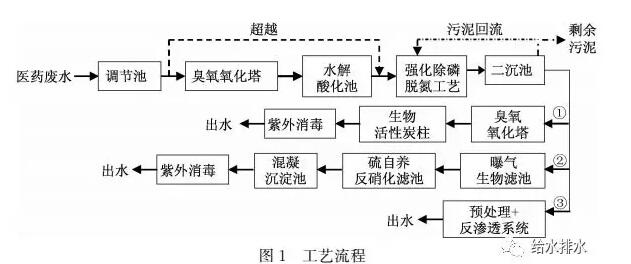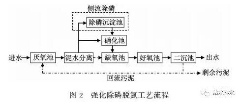醫(yī)藥廢水通過預(yù)處理單元后進(jìn)入強(qiáng)化除磷脫氮工藝的厭氧池,與回流污泥在厭氧池中混合,然后混合液進(jìn)入泥水分離池,在泥水分離池進(jìn)行分離,上清液的20%~30%進(jìn)入除磷沉淀池進(jìn)行化學(xué)除磷,其余上清液泵送進(jìn)入硝化池,污泥與硝化池的硝化液在缺氧池混合,之后泥水混合液進(jìn)入好氧池(后曝氣池),經(jīng)二沉池沉淀后出水進(jìn)入深度處理單元。
