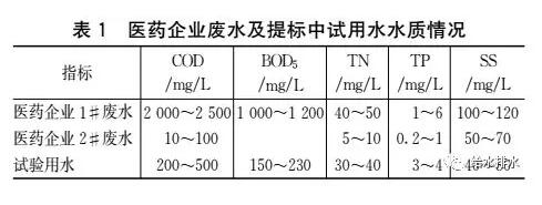 取水方案為采用罐車按3車次/d,每車次7 m3的水量將醫(yī)藥企業(yè)1#廢水運(yùn)送至中試基地內(nèi)調(diào)蓄池;采用管道導(dǎo)入按80~90 m3/d將醫(yī)藥企業(yè)2#廢水泵送至中試基地內(nèi)調(diào)節(jié)池,按企業(yè)1#廢水0.4 m3/h和企業(yè)2#廢水3.8 m3/h混合成試驗用水,具體水質(zhì)情況見表1。
