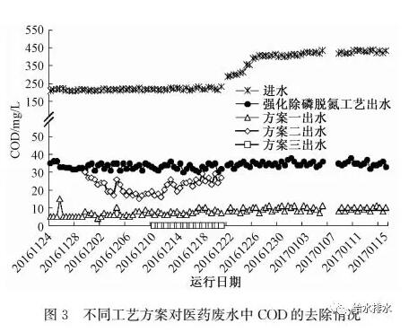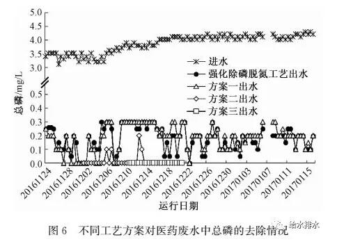 由圖4可以看出,由于醫(yī)藥廢水混合后中氮的濃度較低,在運(yùn)行期間會投加10~15 mg/L的氯化銨來調(diào)整進(jìn)水NH3-N濃度并控制在30~40 mg/L。系統(tǒng)運(yùn)行穩(wěn)定后,平均出水NH3-N低于0.1 mg/L,對于NH3-N的平均去除率已達(dá)到99%以上。由于強(qiáng)化除磷脫氮工藝具有較優(yōu)的硝化效果,NH3-N主要在前端的生物處理單元去除,出水NH3-N濃度較低在0~0.8 mg/L,方案一~方案三出水NH3-N濃度均低于0.1 mg/L。出水滿足IV類水標(biāo)準(zhǔn)限值要求(NH3-N≤1.5 mg/L)。