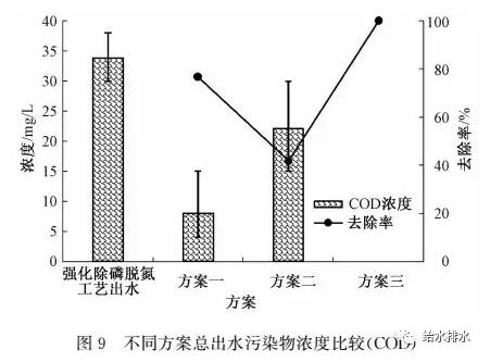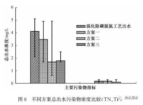 綜上所述,方案三雖然對各污染指標(biāo)均具有最優(yōu)的處理效果,但因其投資成本和運(yùn)行費(fèi)用較高,不適宜大規(guī)模水量處理使用。方案一作為強(qiáng)化除磷脫氮工藝的后接深度處理單元,主要針對二級出水中的有機(jī)物進(jìn)行了強(qiáng)化去除,使得最終出水中各污染物指標(biāo)均可穩(wěn)定到達(dá)地表水IV類標(biāo)準(zhǔn)限值要求。