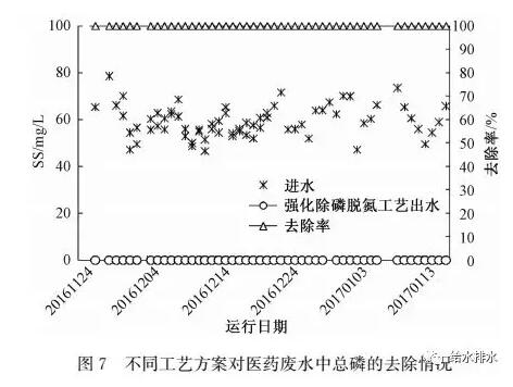 由圖7可以看出,在整個調(diào)試及穩(wěn)定運(yùn)行階段,強(qiáng)化除磷脫氮工藝進(jìn)水SS濃度為42.1~82.3 mg/L,由于強(qiáng)化除磷脫氮工藝出水經(jīng)二沉池沉淀后出水效果穩(wěn)定較優(yōu),出水SS均在檢測限外。