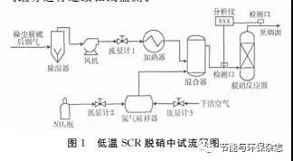 本低溫SCR脫硝中試的工藝流程如圖1所示,采用尾部布設(shè)低溫SCR工藝。流量計1控制進(jìn)入脫硝中試裝置的煙氣量,煙氣經(jīng)除濕器后由電加熱器加熱。氨氣來源于液氨鋼瓶,由流量計2控制進(jìn)入系統(tǒng)的氨氣量,以滿足中試設(shè)定的氨氮摩爾比。流量計3控制進(jìn)入氨氣稀釋器的空氣量,稀釋后的氨氣在混合器中與煙氣充分混合后進(jìn)入脫硝反應(yīng)器。低溫SCR催化劑裝填于脫硝反應(yīng)器中,反應(yīng)器內(nèi)徑0.3m,催化劑裝填高度約0.24m,催化劑層設(shè)有溫度探頭。中試采用德國SICK公司生產(chǎn)的S710多組分氣體分析儀對脫硝反應(yīng)器進(jìn)出口的煙氣組分進(jìn)行連續(xù)在線監(jiān)測。