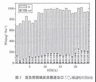 進(jìn)入脫硝中試裝置的煙氣流量約為55m3/h,通過現(xiàn)場調(diào)試,選定催化劑層溫度為150℃進(jìn)行脫硝中試。結(jié)合焦?fàn)t高負(fù)荷運(yùn)行時的尾氣氮氧化物濃度,設(shè)定進(jìn)入系統(tǒng)的氨氣流量為0.35L/min。中試裝置開啟2h后,催化劑層溫度上升并維持在150℃。由分析儀所得數(shù)據(jù)可計算出NOx去除率,即脫硝效率。圖2為反應(yīng)器進(jìn)出口的NOx濃度,淺色柱的峰值對應(yīng)的是反應(yīng)器入口的NOx濃度,深色柱的高度為反應(yīng)器出口的NOx濃度。圖3為與圖2相對應(yīng)的高負(fù)荷運(yùn)行脫硝效率圖。
